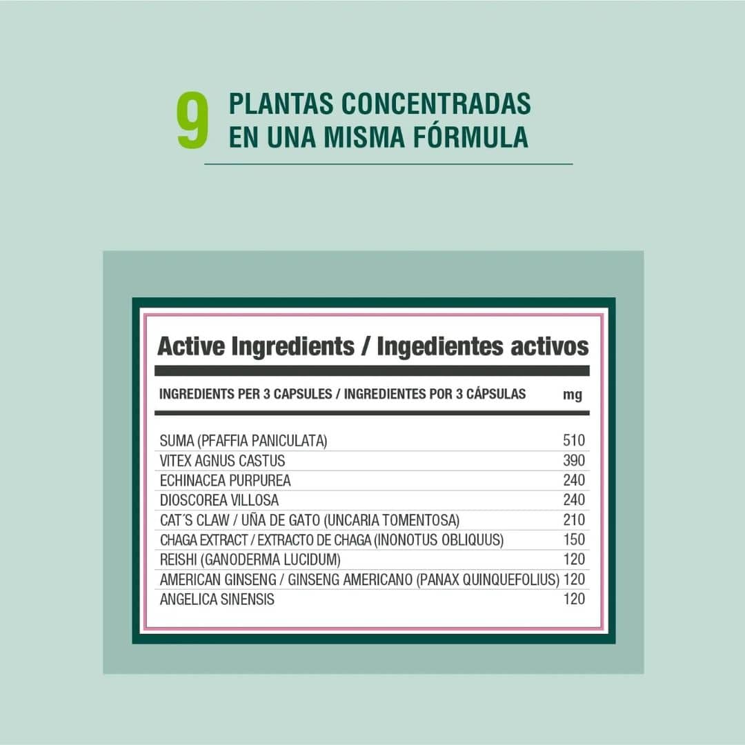 Vitex (Chasteberry), Equinácea Purpúrea, Reishi, Suma, Ginseng Americano, Ñame Salvaje, Pau D'Arco, Dong Quai y Uña de Gato.