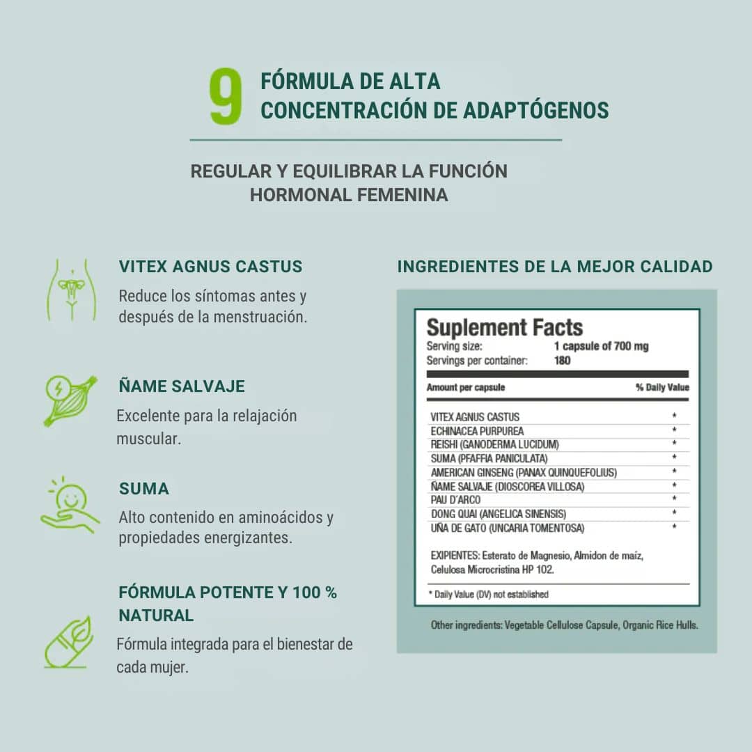 Es una fórmula especialmente creada para apoyar el equilibrio del sistema hormonal femenino mediante una combinación de 9 adaptógenos potentes con propiedades fitoestrógenas, antiinflamatorias, antioxidantes y calmantes.