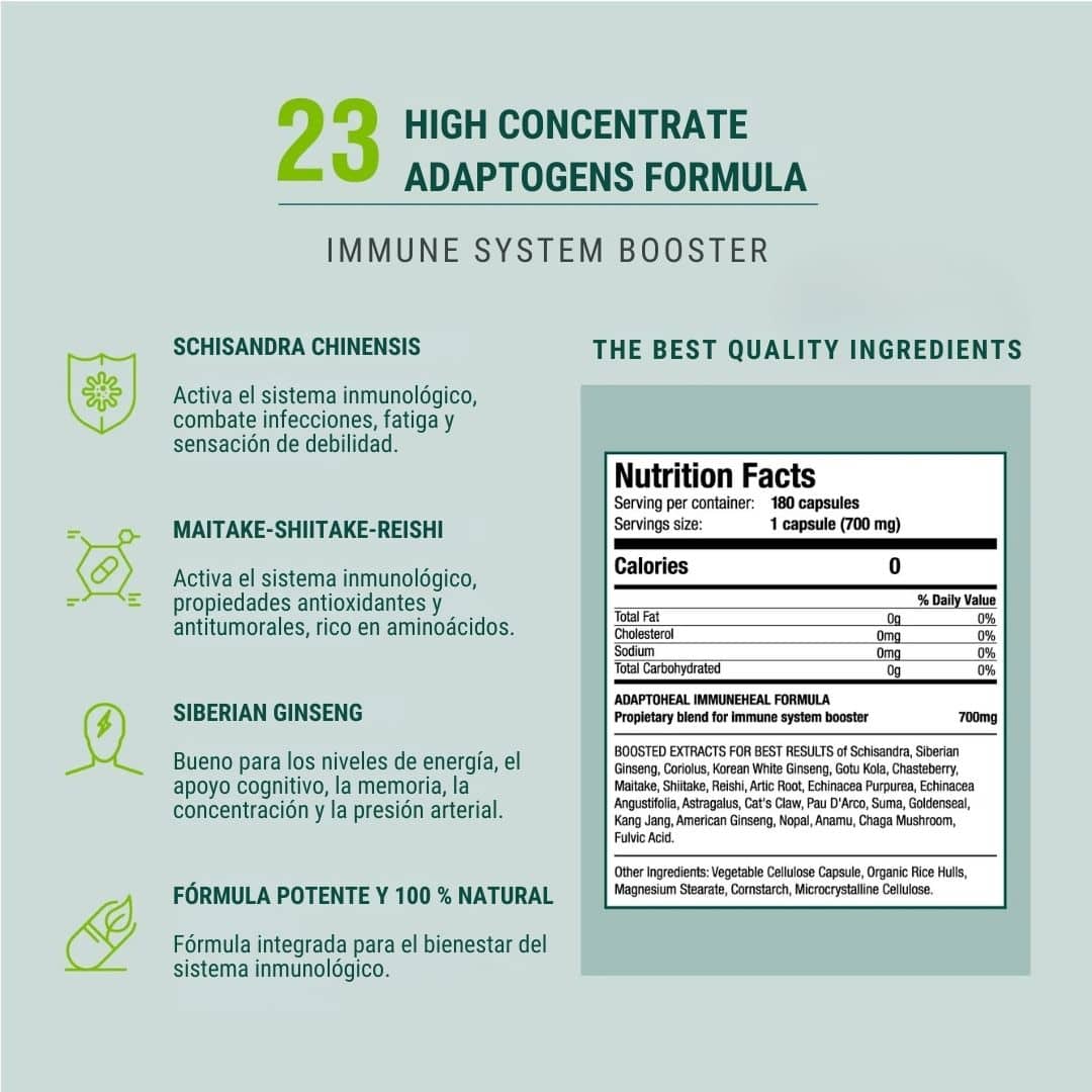 🥇 IMMUNEHEAL despierta tu defensa natural con 22 adaptógenos poderosos: Reishi, Equinácea y Ginsengs premium, que activan y fortalecen tu sistema inmunológico contra virus, resfriados e infecciones. Combate el estrés y mejora tu vitalidad de forma segura, sin efectos secundarios.